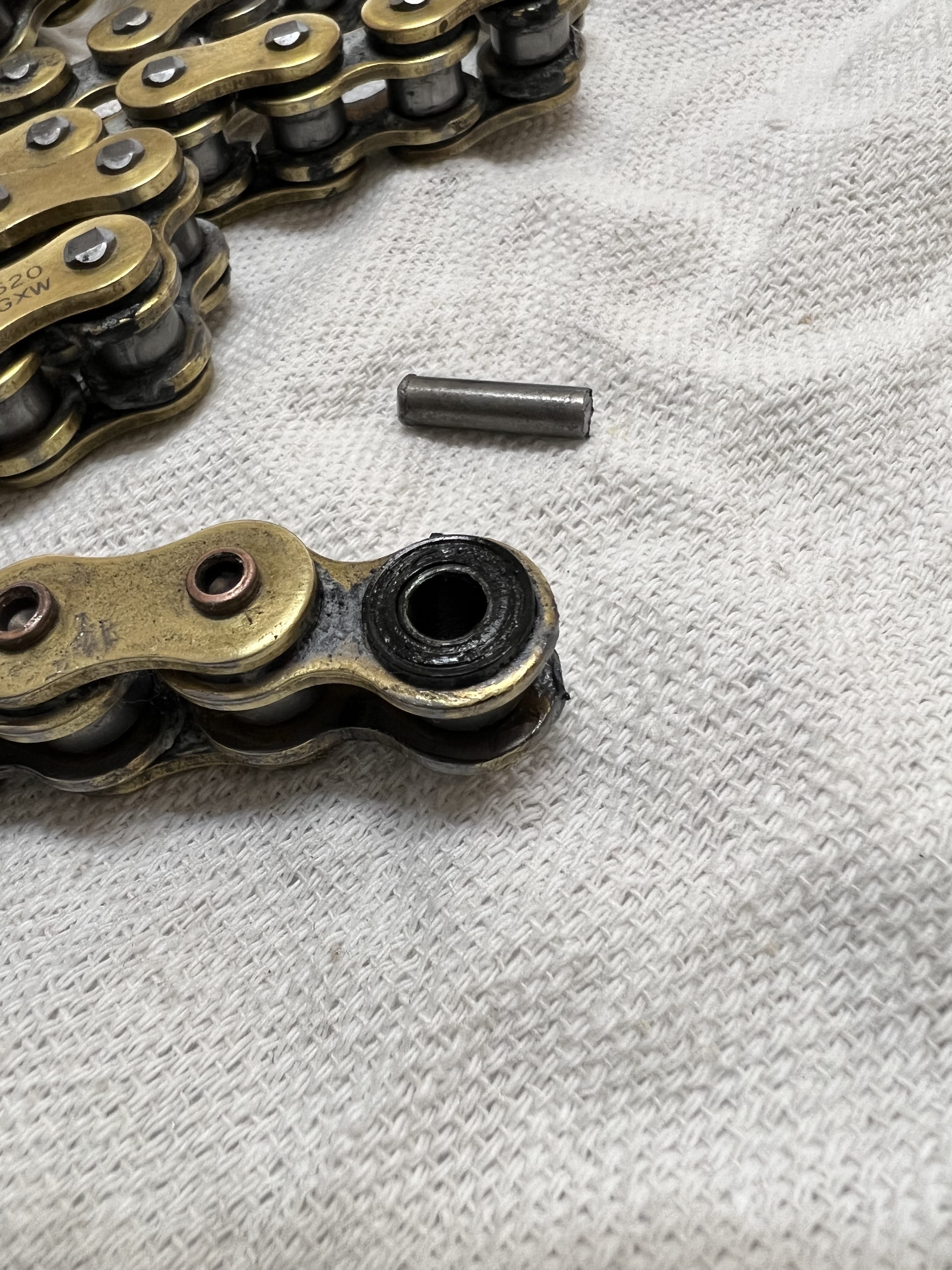 Once the pin is extracted completely, you can simply remove the chain by pulling slowly on one end. Itâll look something like the below, note the extracted pin and o-rings.