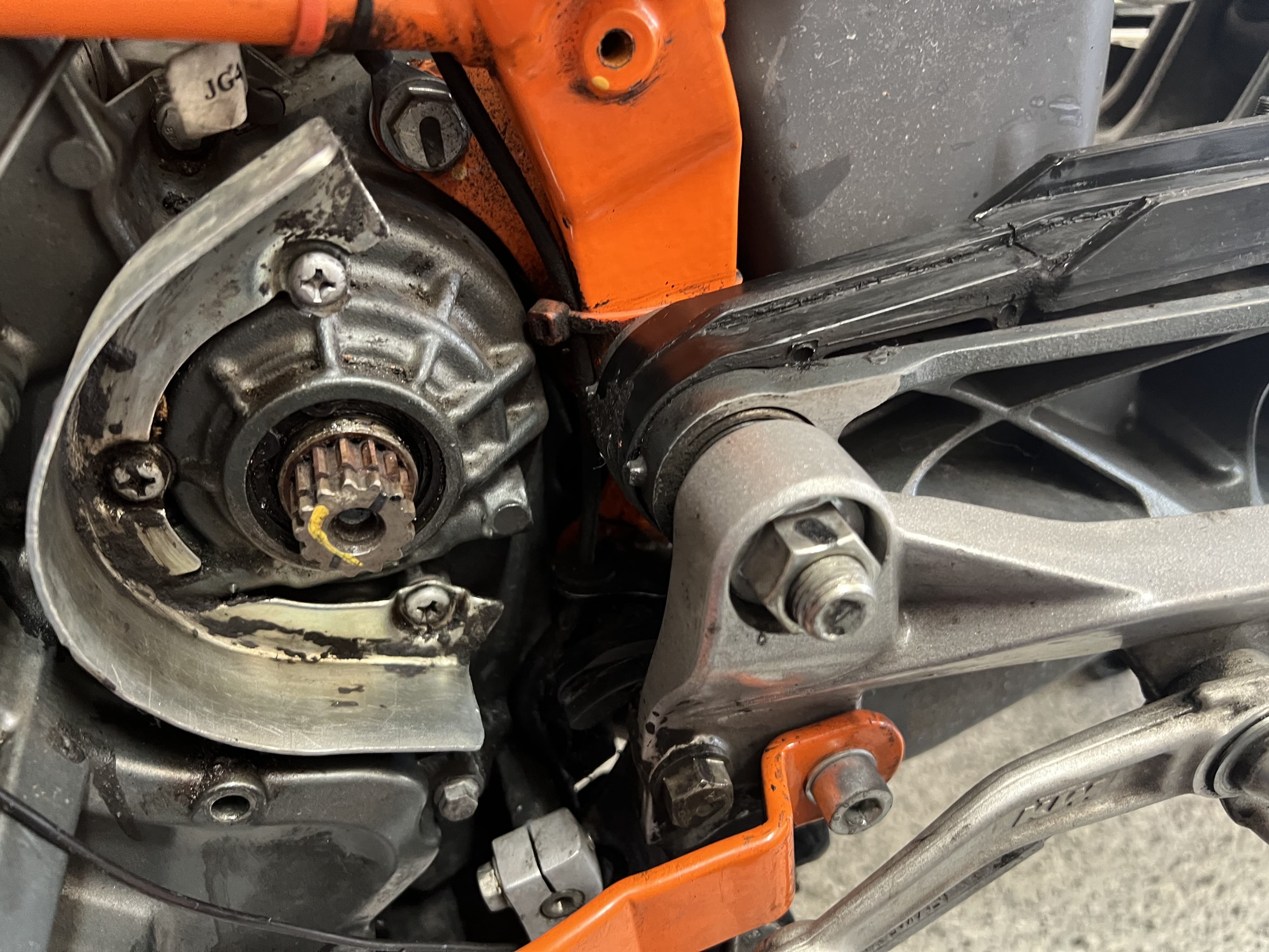 Now that the chain is off, we can replace the front sprocket. As mentioned previously, the steps here will vary from bike to bike. On the 390 Duke, there are two small bolts that hold a retaining clip in place which needs to be rotated slightly. Only after being rotated will the âteethâ on the retaining clip align in a way that the clip can be pulled out. Once thatâs done the front sprocket can simply be pulled off.