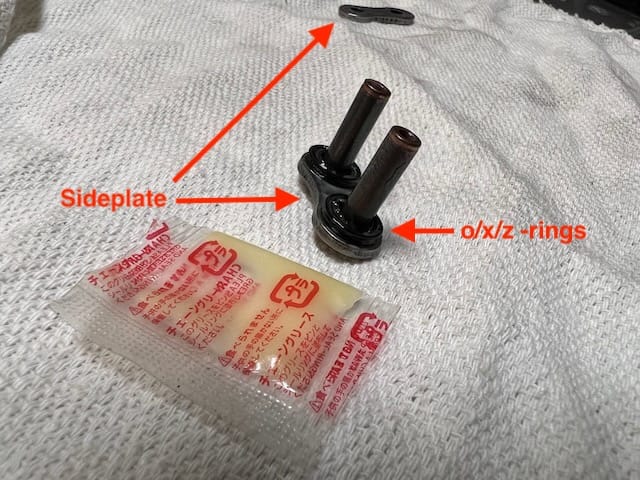 - Slide the first pair of greased o-rings onto the pins of the master link