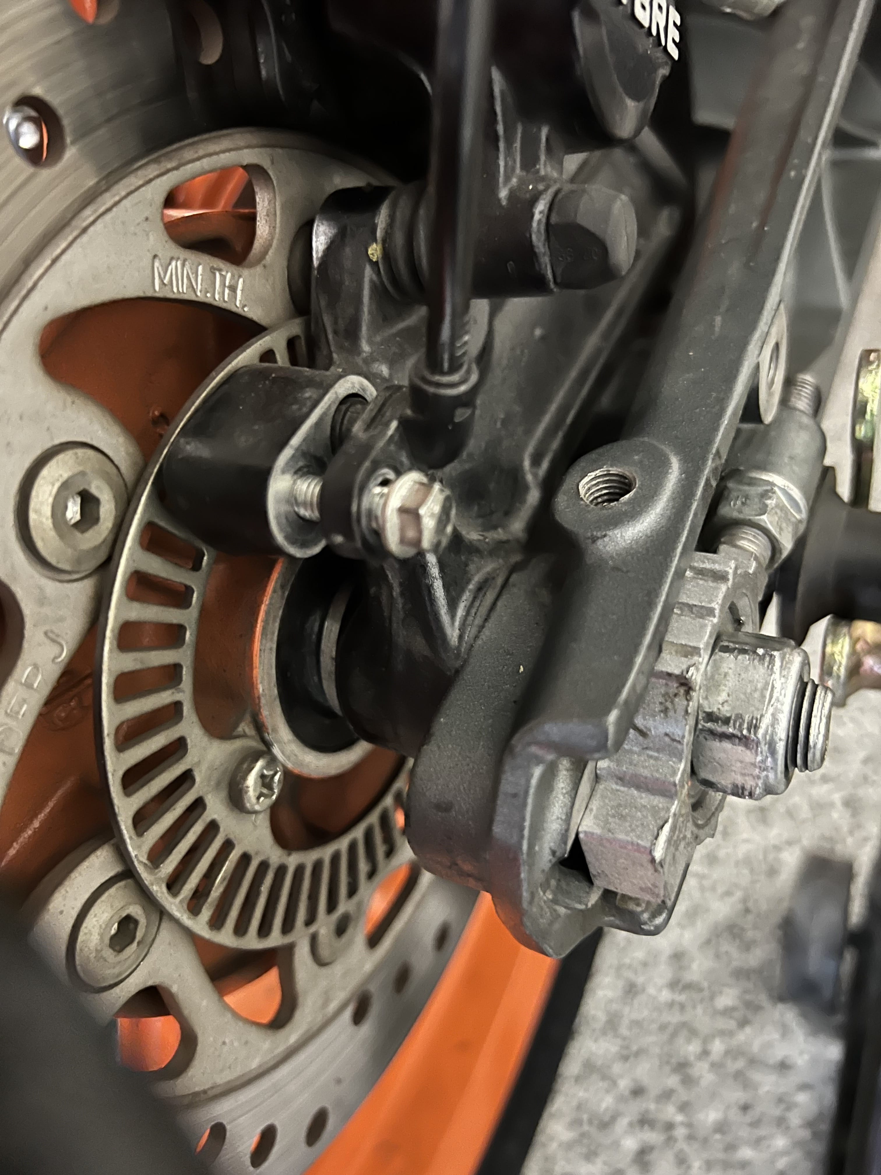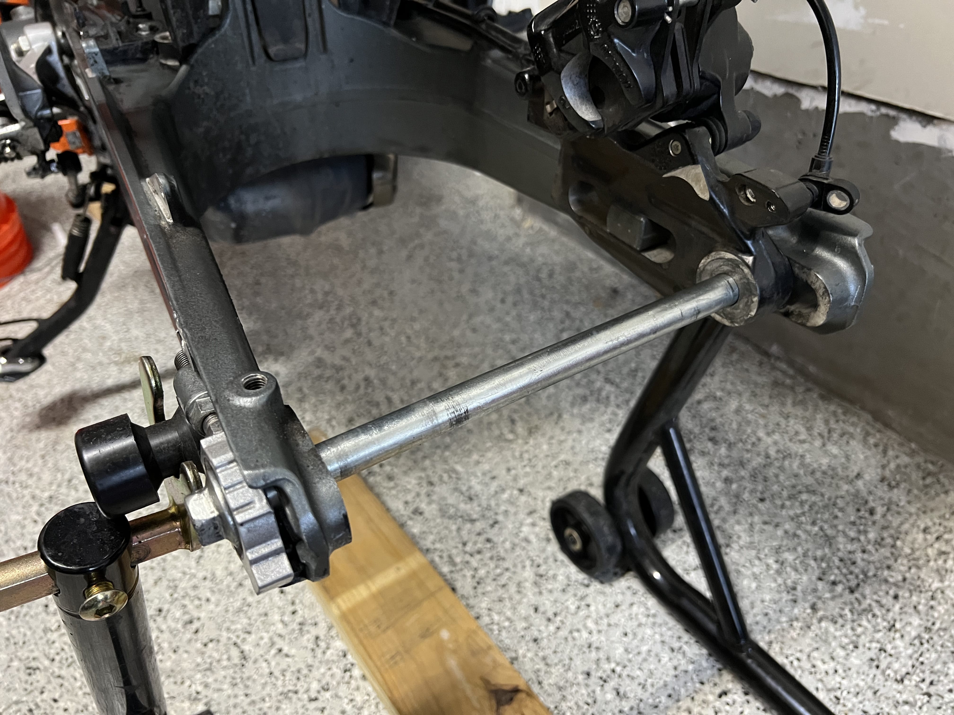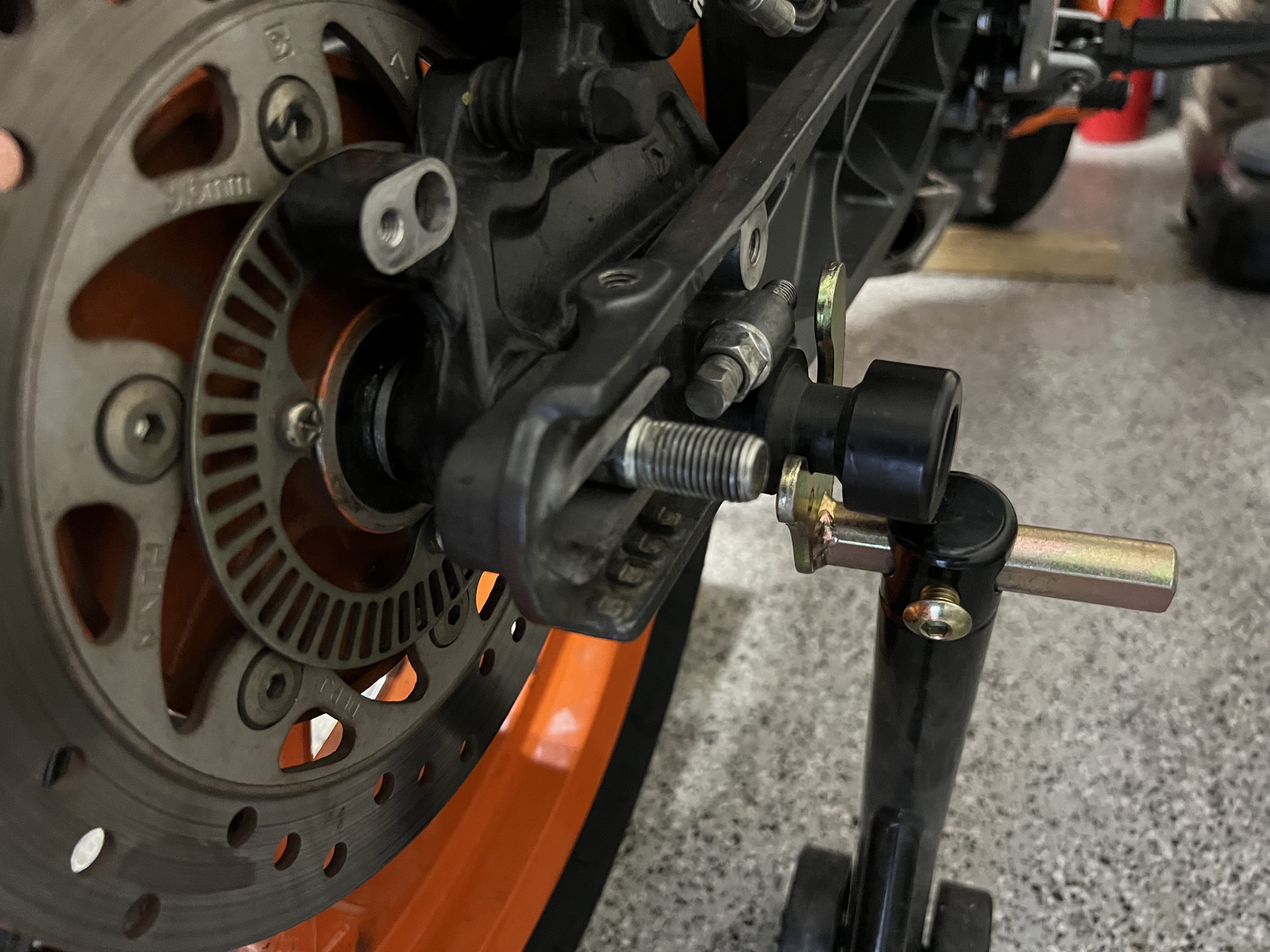 Re-mounting the rear wheel can be a bit tricky. Itâs heavy and special attention needs to be paid so that the rear brake disk smoothly fits between the brake pads again. Again, read up on the instructions for your specific motorcycle. Generally there might be some spacers that need greasing, and the spindle/axle itself should be greased throughout (just making sure to avoid the threading on one end of the spindle). I use generic long-life waterproof grease. Itâs also advisable to remove any grime you see.