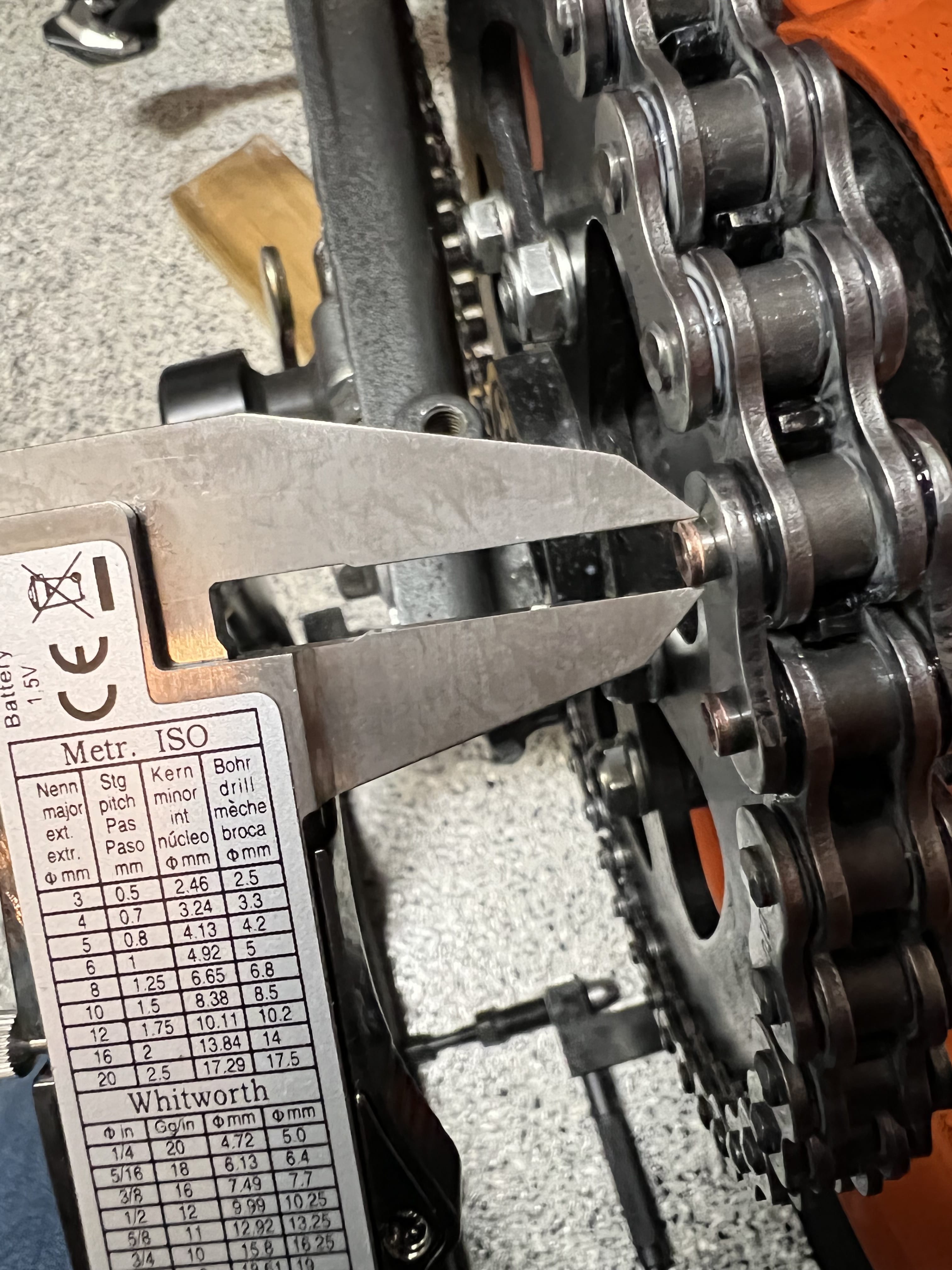 Once again, itâs very handy to have a caliper. A good rule of thumb is to expand the pins until they are about the same width as the factory riveted ones on the other link on the chain. I switched between the two pins, slowly expanding and measuring each in turn.